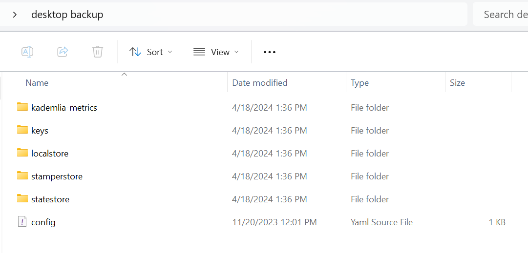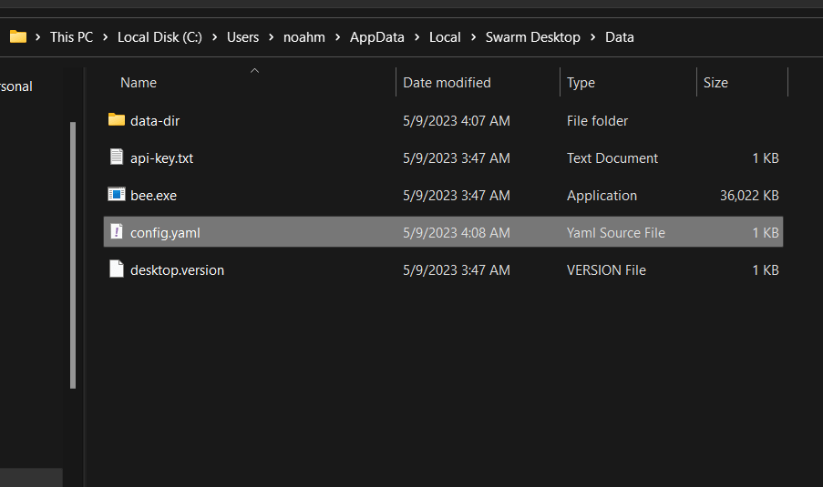In addition to the data folders, you will also need the password found in the config.yaml file in order to restore a Bee node from backup. Move up one directory from Data DIR to the Data directory, and create a copy of the config.yaml file and save it along with the other folders you just backed up: