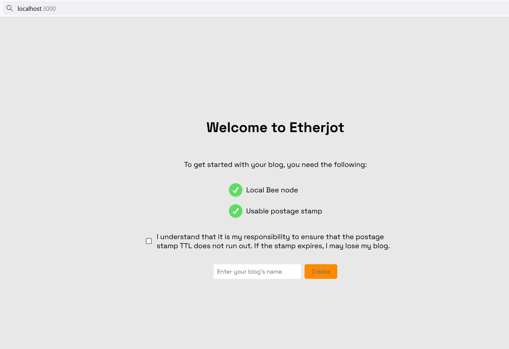 Fill in your blog name, check the box with the TTL warning, and click the "Create" button to initialize your blog. This will issue a Swarm transaction to set up a feed for your blog. The transaction will take a few moments, after which you will be greeted with the Etherjot Web blog editor.
