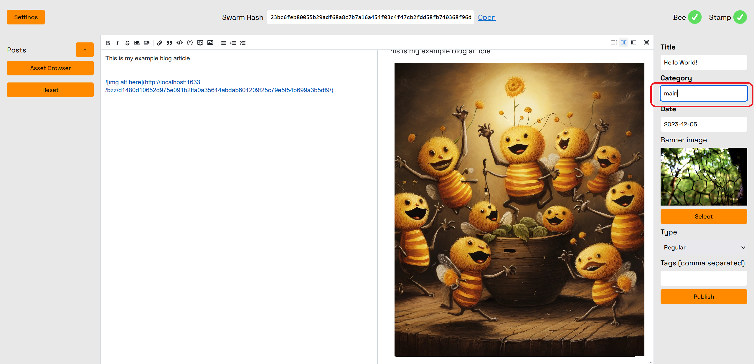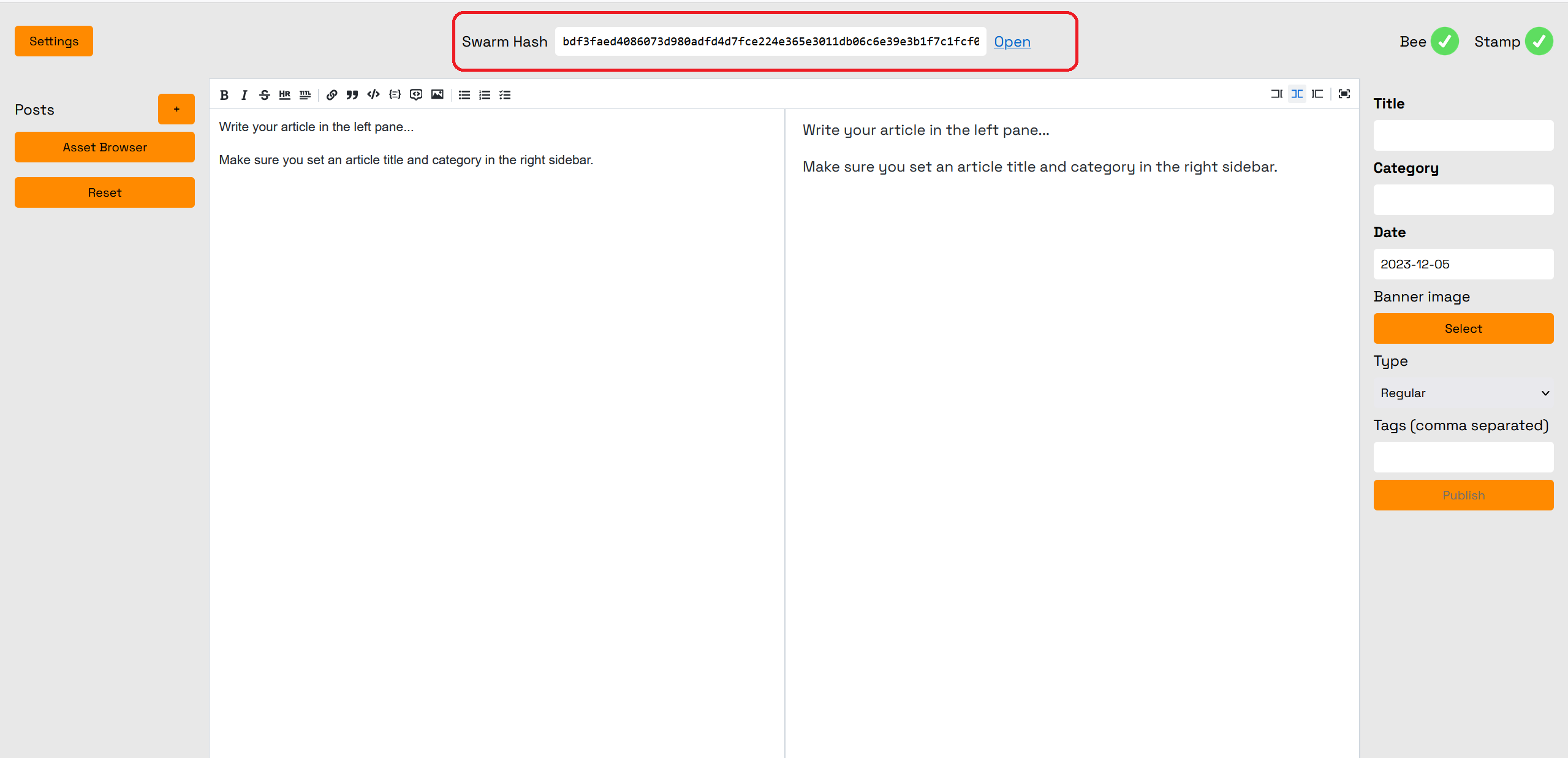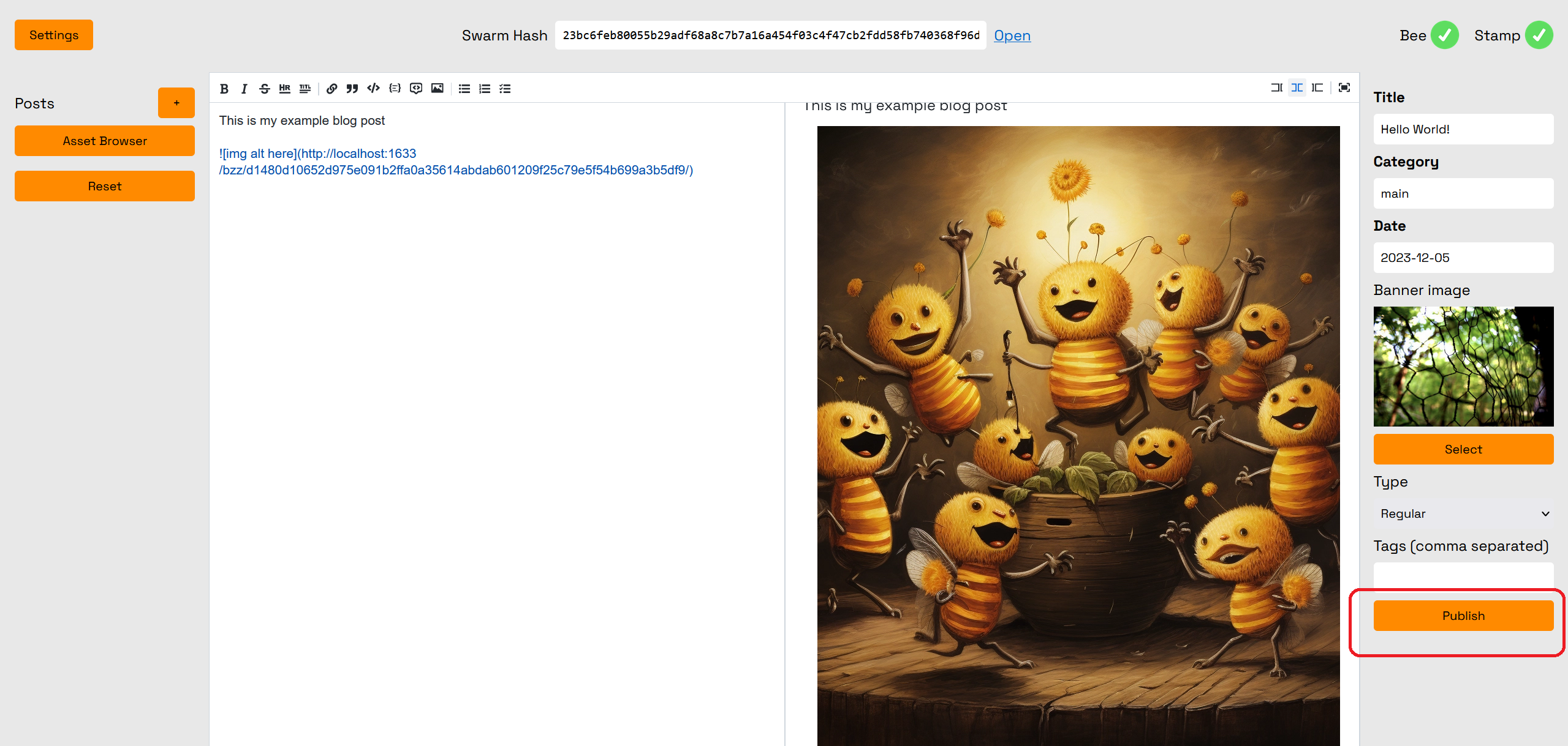 Now we are ready to publish our first blog post! Simply click the "Publish" button to initiate the transaction on Swarm to upload your blog.