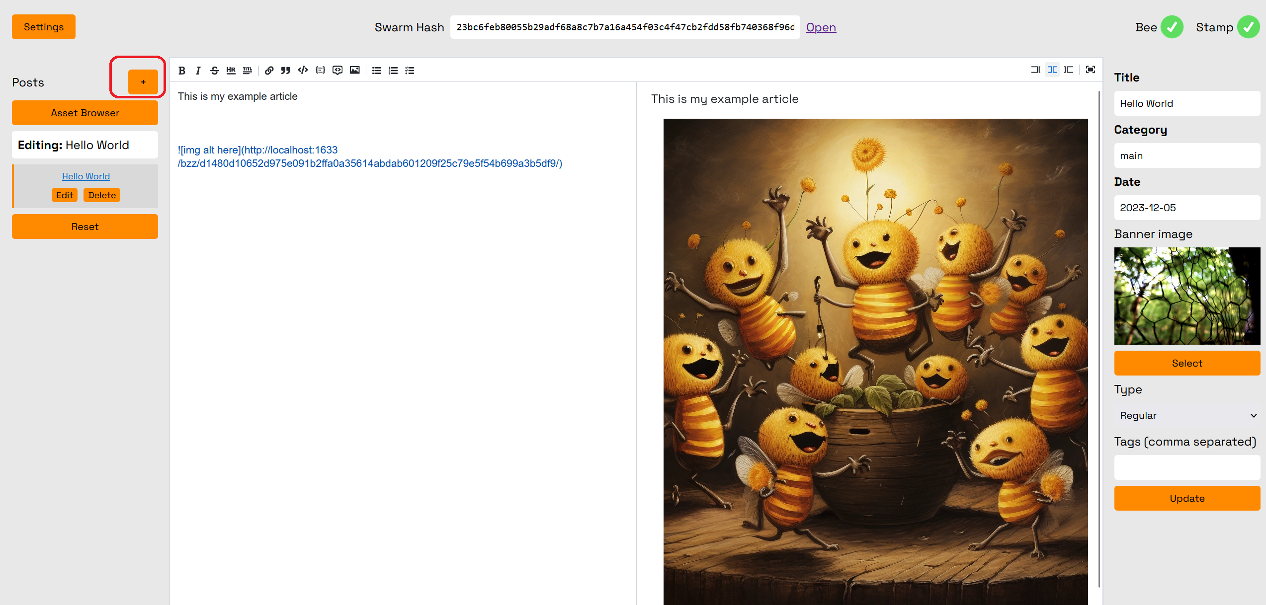 To get started you must first have installed Swarm Desktop and have it running on your computer with a valid stamp batch. Note that your blog will only stay online as long as the postage batch is still valid, therefore you must make sure to stay aware of the postage batch TTL (time to live), and top up your batch regularly in order to keep your content online.