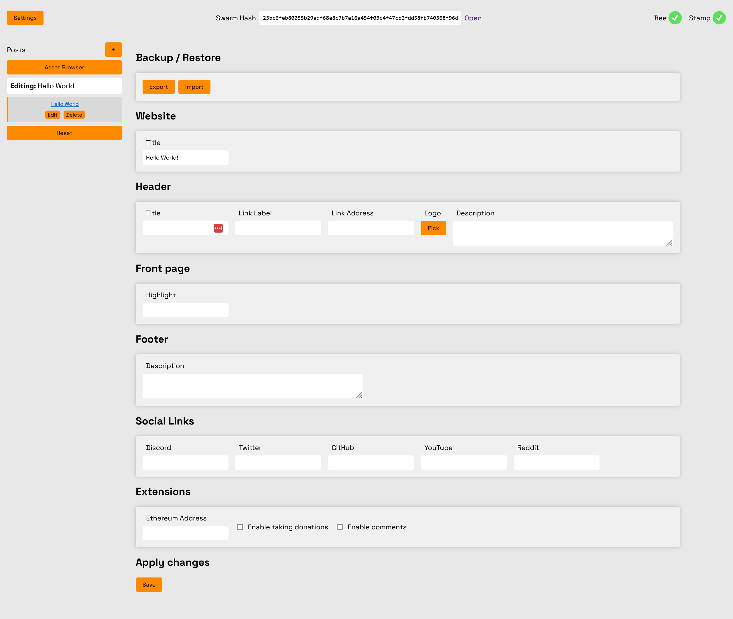 The "Swarm Hash" displayed at the top of the editor is the address for the homepage of your blog. Click "Open" to navigate to your blog. We can see now that the blog has been initialized, but no content has been uploaded.